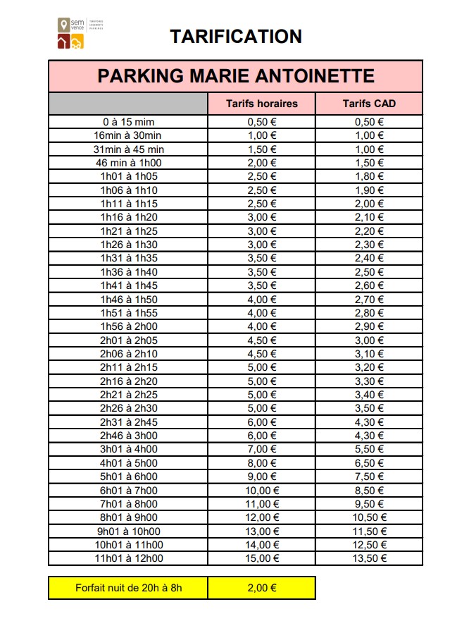 GRILLE TARIFAIRE PARKING MARIE-ANTOINETTE